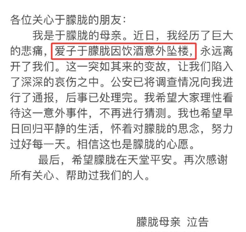 于朦胧去世9天后,网上的各种传言也逐渐平息,虽然大家都无法接受这么好的一位艺人突然去世,可于朦胧的母亲发文后,已经能够证实对方系醉酒坠亡,排除了其他刑事案件的可能
