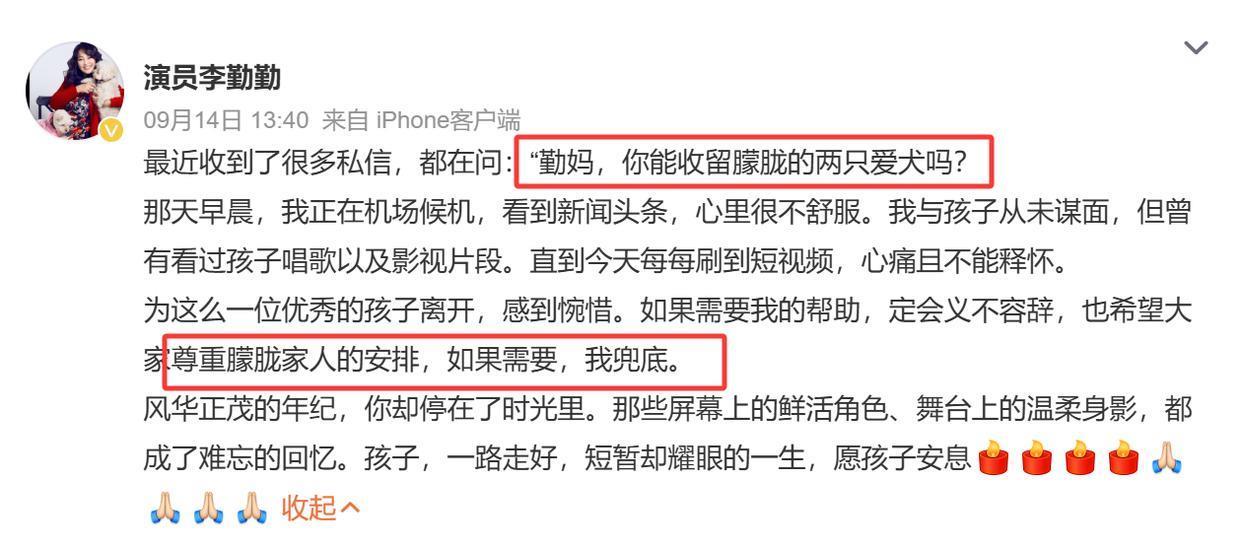 于朦胧去世后,大家也在担心这两条狗会不会被弃养,甚至还有人联系了演员李勤勤,询问对方会不会收养于朦胧的爱犬,毕竟此前李勤勤就曾收养过周海媚的宠物,当时这件事还引起了不小轰动