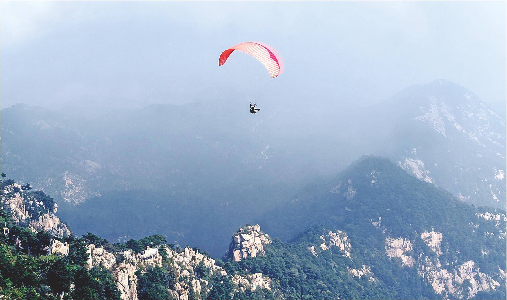 9月14日,在临沂市沂蒙山银座天蒙旅游区,游客在教练的陪同下体验低空滑翔飞行。